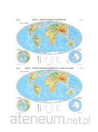 Dwustronna mapa ogólnogeograficzna świata Na pierwszej stronie znajduje się mapa hipsometryczna świata w skali 1:19 000 000 oraz dodatkowo mapy Arktyki i Antarktydy sporządzone w tej samej skali. Mapa ta umożliwia prezentowanie uczniom rozmieszczenia oraz ukształtowania powierzchni lądów i mórz na świecie. Druga strona ułatwia sprawdzenie u uczniów znajomości rozmieszczenia kontynentów oraz głównych krain geograficznych świata.