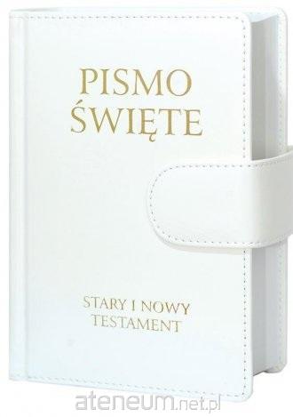 Praktyczne, kieszonkowe wydanie Pisma Świętego, w oprawie skóropodobnej z zapięciem magnetycznym, w kolorze białym.