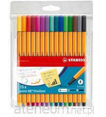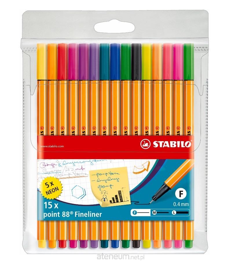 Uniwersalny cienkopis do pisania, podkreślania, kreślenia i kolorowania. Mocna, oprawiona w metal końcówka jest odporna na złamania i rozwarstwienia, co gwarantuje wysoki komfort pisania aż do całkowitego wyczerpania tuszu. Grubość linii 0,4 mm. Wentylowana skuwka umożliwia oddychanie w przypadku nagłego połknięcia. Plastikowe etui zawierające 15 szt. 10 podstawowych i 5 neonowych.