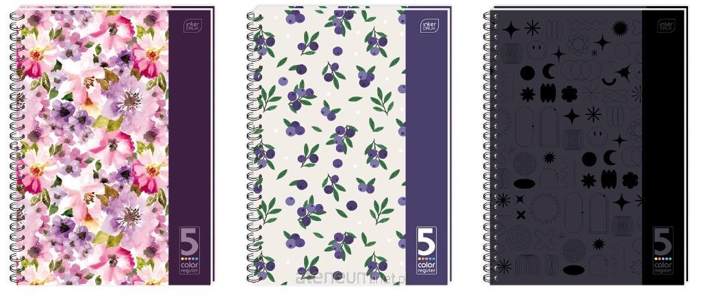 Format: B5. Liczba kartek: 160. Zadruk w kratkę. Ostre rogi. Podwójna spirala zamykana. Otwory do segregatora. Perforacja wzdłuż grzbietu, ułatwiająca wyrywanie kartek. Spirala po długim boku. W środku 5 kolorowych, wycinanych registrów.