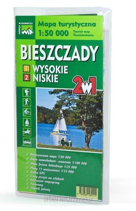 Pierwsza mapka przedstawia obszar Bieszczad Wysokich, na południe od Jeziora Solińskiego czyli Pasmo Połonin, Pasmo Graniczne, Wysoki Dział, Pasmo Łopiennika, Otryt oraz Ostre do granicy państwa. Na mapie zaznaczono dokładnie przebieg znakowanych szlaków turystycznych z czasem przejścia, znakowanych szlaków o charakterze lokalnym, szlaki narciarskie, konne, rowerowe, przebieg wszystkich rodzajów linii komunikacyjnych oraz granice parku narodowego i krajobrazowego. Z boku zamieszczono praktyczne informacje: numery telefoniczne (alarmowe, ratunkowe i do schronisk) oraz informacje komunikacyjne. Przydatnym dodatkiem są dwie fotograficzne panoramy z Tarnicy i Połoniny Cyrańskiej. Dzięki nim łatwo rozpoznać ważniejsze szczyty. Na rewersie znajduje się mapa samochodowo-rowerowa w skali 1:100 000, pomocna w planowaniu dłuższych wycieczek. Ma naniesione zasięgi poszczególnych map i planów zamieszczonych w komplecie zawiera też szlaki turystyczne z czasami przejść. Rewers zawiera również historię i opis Bieszczadów, Bieszczadzkiego Parku Narodowego z fragmentami regulaminu BPN oraz praktyczne rady i telefony do domów wczasowych, hoteli, moteli , kempingów itp. Znajdziemy też plany niektórych bieszczadzkich miejscowości oraz informacje dotyczące form aktywnego wypoczynku, które zadowolą turystów przyjeżdżających po raz pierwszy w Bieszczady. Na drugiej mapce przedstawiono rejon Bieszczadów Niskich, obszar wokół Jeziora Solińskiego rozciągający się od Komańczy na wschodzie do Czarnej Góry na zachodzie i od Zagórza na północy do Cisnej na południu. Rewers zawiera mapkę Jeziora Solińskiego i okolic wraz z opisami i mapkami najciekawszych miejscowości. Uwagę również przykuwa panorama z Polańczyka. Dla amatorów cerkwi znajdują się opisy tych charakterystycznych dla Bieszczad zabytków wraz z umiejscowieniem na mapie. W wyróżnionej ramce umieszczono telefony alarmowe. Mapa posiada praktyczny falc mapowy.