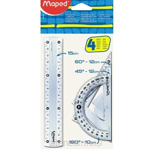 Geometryczny zestaw linijek START w skład którego wchodzą: linijka 15 cm, ekierka 45-15cm, ekierka 60 -15cm, kątomierz 180-10 cm . Linijki są bardzo wysokiej jakości, wykonane z krystalicznie przezroczystego tworzywa sztucznego. Nadruk na skali wykonany jest tuszem odpornym na promienie ultrafioletowe co zabezpiecza przed płowieniem.