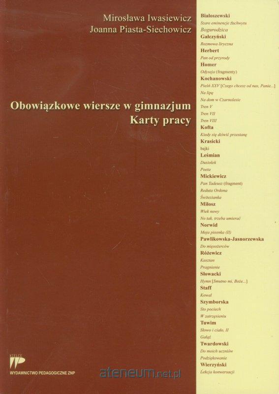 Obowiązkowe wiersze w gimnazjum. Karty pracy to znakomita pomoc w przygotowaniu do egzaminu gimnazjalnego uczy wnikliwej analizy i interpretacji, będzie służyć uczniowi przez trzy lata. Publikacja obejmuje ponad 30 utworów (lirycznych i wierszowanych epickich) z podstawy programowej, począwszy od Bogurodzicy i trenów Jana Kochanowskiego, a skończywszy na liryce współczesnej Mirona Białoszewskiego i Jana Twardowskiego. Zadania dla ucznia są oryginalne. Dzięki formie graficznej (tabele, wykresy, schematy, rysunki) uaktywniają różne obszary percepcji i pobudzają twórcze myślenie. Pracując z kartami, gimnazjalista zyskuje narzędzia odbioru, analizy i interpretacji, dzięki którym jego lektura jest coraz dojrzalsza, bardziej świadoma i samodzielna: utrwala i posługuje się pojęciami teoretycznoliterackimi z zakresu liryki, rozróżnia gatunki i konwencje, odkrywa konteksty kulturowe, historyczne, biograficzne, wykorzystuje poznane pojęcia w refleksji o literaturze i wartościach.