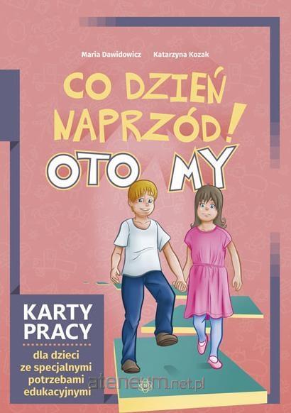 CO DZIEŃ NAPRZÓD! OTO MY Karty pracy dla dzieci ze specjalnymi potrzebami edukacyjnymi Karty pracy Co dzień naprzód! wzbogacą warsztat pracy nauczycieli oraz terapeutów pracujących z najmłodszymi dziećmi oraz dziećmi ze specjalnymi potrzebami edukacyjnymi. Opracowanie powstało z myślą o: przedszkolakach, których rozwój przebiega typowo; przedszkolakach, których rozwój przebiega nieharmonijnie lub z opóźnieniem; uczniach początkowych klas szkoły integracyjnej lub specjalnej; uczniach ośrodków rewalidacyjno-wychowawczych. Zadania mają na celu poszerzanie wiedzy dziecka o samym sobie, o najbliższym i dalszym otoczeniu, o zachodzących w świecie prawidłowościach. Pomagają rozwijać myślenie przyczynowo-skutkowe, funkcje percepcyjne oraz sprawność grafomotoryczną. Polecenia zostały sformułowane w taki sposób, żeby nieustannie, przy każdej okazji zachęcać dziecko do mówienia lub komunikowania się w dostępny mu sposób. Publikacja Co dzień naprzód! składa się z trzech części (Oto ja, Oto my, Oto świat). Wszystkie ćwiczenia zostały przygotowane na trzech poziomach trudności, które oznaczono literami A, B, C.