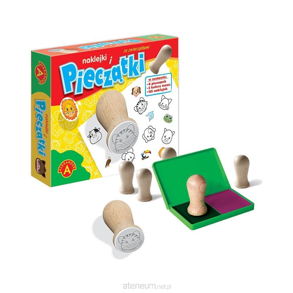 Zestaw kreatywny dla dzieci składający się z 6 pieczątek z wzorami zwierzątek (kotek, piesek, myszka, świnka, tygrysek, krówka), które można odbijać na kartce czarnym i czerwonym tuszem z poduszek znajdujących się w specjalnym, plastikowym pudełku. Odbite kształty można kolorować kredkami lub dodatkowo ozdabiać nimi swoje rysunki. 135 kolorowych naklejek urozmaica zabawę. Wszystkie elementy znajdują się w eleganckiej, funkcjonalnej wyprasce.