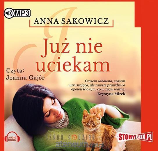 Joanna potrafi zaskakiwać zarówno siebie, jak i najbliższych. Jest narzeczoną Artura, iskrzy między nią a Jaromirem, w dodatku pojawia się kolejny zagadkowy mężczyzna. Pomimo wątpliwości, bohaterka zaczyna urzeczywistniać swoje marzenia. Przeprowadza się na Kociewie i podejmuje decyzję o uruchomieniu kawiarni w lokalu, z którym wiążą się pewne tajemnice. Nadal pracuje jako wolontariuszka w hospicjum dla dzieci. Pisze dla nich bajki. Wkrótce zgłasza się poważny wydawca, który chce je opublikować, ale stawia warunki... Nowa opowieść Anny Sakowicz jest historią o dojrzałej, potarganej przez życie kobiecie, która pragnie stworzyć prawdziwy dom z właściwym partnerem. "Już nie uciekam" to audiobook Anny Sakowicz, który zamyka trylogię kociewską ("Złodziejka marzeń", "To się da!"). Słuchacze cenią jej pełne dobrej energii powieści, w których w lekkiej, zaprawionej dowcipem formie, poruszane są trudne i ważne tematy. Czas trwania: 12:22:00 h.