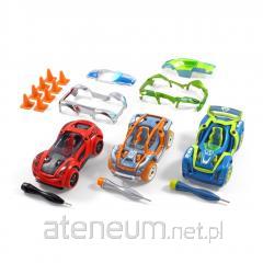 pomarańczowa maska i błotniki samochodu terenowego, niebieska zabudowana maska i srebrny błotnik drogowej wyścigówki, rama samochodu terenowego, podwozie samochodu terenowego, siedzenie, 4 koła, 2 zawieszenia, opakowanie zawiera łatwy w obsłudze śrubokręt.