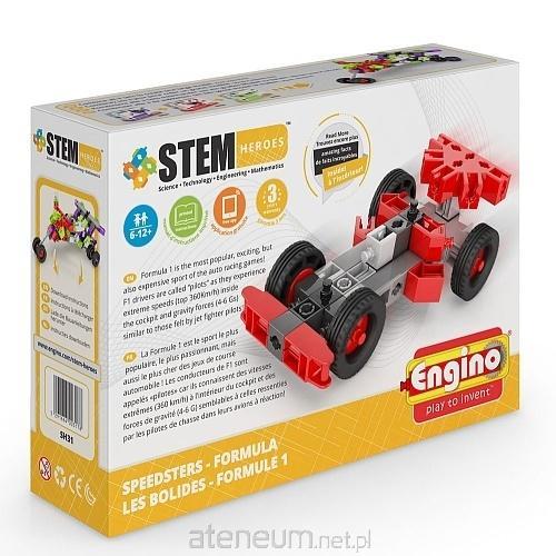 Zestawy klocków STEM Heroes, seria Pojazdy wyścigowe, umożliwiające zbudowanie 1 modelu z każdego zestawu, ulotka informacyjna dotycząca tematyki danego zestawu, bezpłatna aplikacja do ściągnięcia z Internetu. Zestawy łączą się, po zebraniu trzech zestawów można zbudować model combo'.