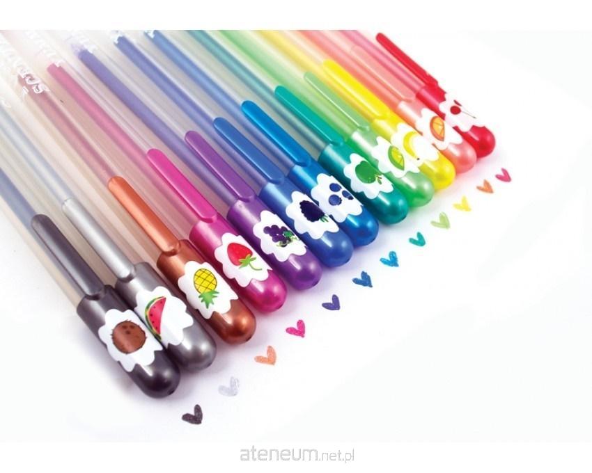 Pysznie owocami pachnące brokatowe długopisy żelowe sprawią, że każdy obrazek, notatki będą cudownie wyglądają i pachną. Cokolwiek napiszesz i narysujesz, będzie niesamowicie kolorowe i błyszczące, a do tego owocowo pachnące. Owocami pachnące brokatowe długopisy żelowe wyglądają ślicznie, pysznie pachną i piszą jak jedwab, nikt się nim nie oprze. Zestaw zawiera 12 owocowych zapachów i kolorów - limonka, banan, pomarańcza, czereśnia, truskawka, winogrona, zielone jabłko, jeżyna, jagoda, arbuz, kokos i ananas. Długopisy żelowe ze szlachetnym kamieniem. Yummy yummy scented Glitter Gel Pens. 12 różnych owocowych zapachów. 12 kolorów. Obrazki owoców na skuwkach. Brokatowy, błyszczący tusz. Piszą gładko.