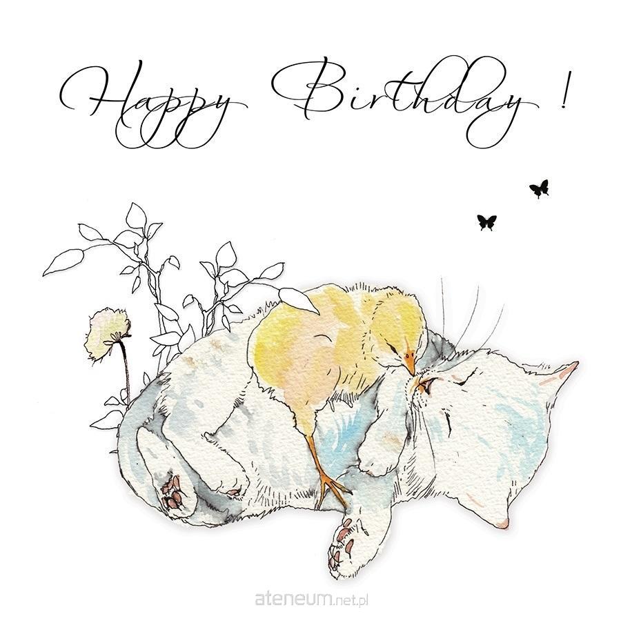 Karnet bez tekstu z kopertą, ręcznie robiony z kryształkiem Swarovski, Urodziny kot i pisklę.
