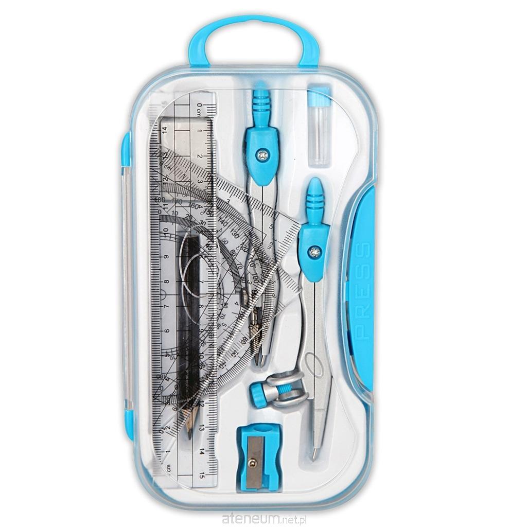 Zestaw składający się z dwóch cyrkli: metalowego z grafitem 2 mm oraz z ołówkiem, kompletu geometrycznego, temprówki i pojemnika na zapasowe grafity. Całość w kolorowym etui z zawieszką.