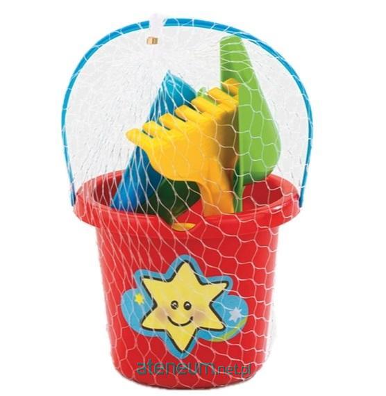 W zestawie 6 elementów: wiaderko, grabki, łopatka, 3x foremki