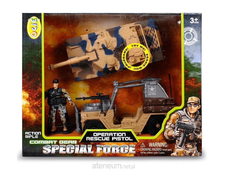 W zestawie: czołg, żołnierz, jeep wojskowy. Funkcje: dźwięk, światło - czołg.