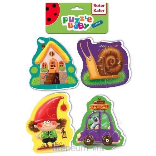 Baby puzzle są to pierwsze puzzle dla najmłodszych. Komplet zawiera cztery obrazki z ulubionymi zwierzętami z zoo. Dziecko ma za zadanie połączyć elementy puzzli, układając poszczególne zwierzęta. Puzzle o różnej ilości elementów (trzy, cztery, pięć) pomogą dziecku nauczyć się łączyć osobne części w jedną całość zgodnie z zasadami logiki. Zabawa rozwija drobną motorykę, logikę, koncentrację uwagi, skupienie. Zestaw: 4 obrazki, 16 elementów.