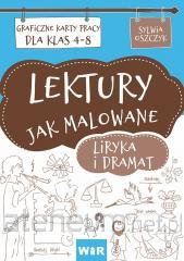Liryka i dramat to karty pracy do utworów: Asnyka, Barańczaka, Białoszewskiego, Czechowicza, Gajcego, Herberta, Horacego, Iłłakowiczówny, Karpińskiego, Kasprowicza, Kochanowskiego, Krasickiego, Krasińskiego, Lechonia, Leśmiana, Mickiewicza, Miłosza, Moliera, Morsztyna, Mrozka, Naborowskiego,Norwida, Pawlikowskiej-Jasnorzewskiej, Poświatowskiej, Przerwy-Tetmajera, Przybosia, Różewicza, Rymkiewicza, Słowackiego, Sofoklesa, Staffa, Sępa-Szarzyńskiego, Szekspira, Szymborskiej, Tuwima, Wierzyńskiego, Wyspiańskiego.