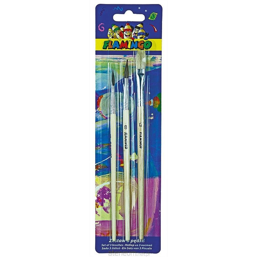 Zestaw trzech pędzli z naturalnym włosiem. Wytrzymałe drewniane uchwyty z oznaczeniem grubości. Pędzle sprawdzą się idealnie zarówno na zjęciach malowania farbami w szkole, jak i w domu. Zestaw zawiera 3 pędzle: 2 okrągłe i 1 płaski. Pędzle okrągłe o grubościach: 6 mm i 8 mm. Pędzel płaski o grubości: 12 mm. Pakowane na blistrze. 3 szt.