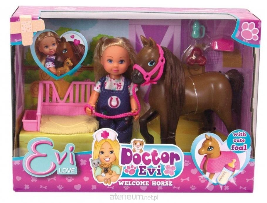 EL Doktor Evi i klacz w ciąży Dziewczynki lubią wcielać się w zawodowe role, zabawa w weterynarza to świetny sposób na zdobywanie nowych umiejętności i empatii dla zwierząt. Evi pomaga w narodzinach źrebaka, który mieści się w brzuchu klaczy. Zabawę dopełniają niezbędne dodatki jak kojec, pled i buteleczka dla źrebaka. Evi troskliwie karmi źrebaka butelką, którą można precyzyjnie mocować w rączkach laleczki za pomocą wypustek. Laleczka ma zginane w kolanach nóżki i ruchome nadgarstki. Wysokość lalki: 12 cm, 3l+