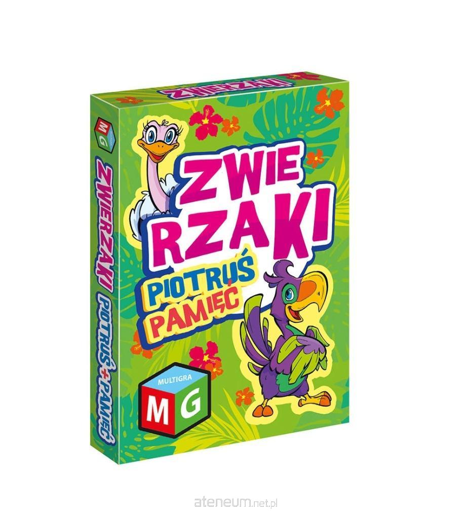 Pamięć - karty rozkłada się na stole zakryte. Gracze odkrywają po kolei po dwie karty. Jeśli tworzą parę - gracz zyskuje punkt. Barwne ilustracje wprowadzają dziecko w świat zwierząt.