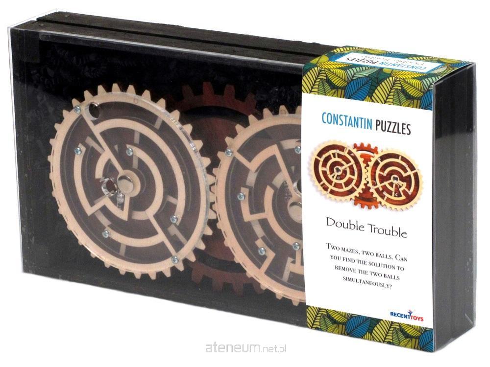 Celem łamigłówki jest wyciągnięcie dwóch kulek, dokładnie w tym samym czasie. Każde z kół zębatych ma znak na drewnianej obręczy. Obróć je w taki sposób, aby znalazły się one obok siebie. Wrzuć kulki przez wyprofilowane otwory w kształcie litery "C" i rozpocznij zabawę! Ponieważ koła zębate poruszają się w tym samym czasie, krok do przodu na jednym, może być krokiem w tył na drugim. Spróbuj dotrzeć do obu wyjść albo kulki już na zawsze pozostaną w labiryncie! Jean Claude Constantin jest niewątpliwie jednym z najbardziej zapracowanych projektantów łamigłówek ostatnich trzydziestu lat. Wyjątkowe i różnorodne pomysły, które powstają w jego głowie, przemieniają się w unikalne i wizualnie zachwycające projekty. Łamigłówki Jean Claude'a uznawane są za bardzo wymagające. Aby je rozwiązać, będziesz potrzebował dużej aktywności szarych komórek, odpowiedniej koncentracji i odrobiny wyobraźni. Recent Toys to producent łamigłówek z Holandii. Jak sami o sobie mówią: Tworzą zagadki dla wszystkich. Jeżeli lubisz matematykę, logikę, układanie wzorów lub po prostu jesteś cierpliwy i wytrwały, to na pewno znajdziesz coś dla siebie! Choć wszystkie łamigłówki są unikatowe to mają one następujące cechy wspólne: 1. Prostota zagadki są łatwe do wytłumaczenia. Nasz umysł ma się skupić na rozwiązaniu łamigłówki, a nie na zrozumieniu zasad. 2. Mądrość łamigłówki są zaprojektowane tak, aby zmusić nasz umysł do poszerzenia horyzontów i otwarcia na nowe pomysły. 3. Wytrzymałość łamigłówki zbudowane są z odpowiednich materiałów. Elementy można przesuwać z wyjątkową łatwością. Chodzą płynnie, szybko i się nie zacinają. Podejmij wyzwanie! Popraw kondycję swojego umysłu! ZAWARTOŚĆ: łamigłówka Double Trouble (wymiary: 20,5x11x1,5 cm) książeczka
