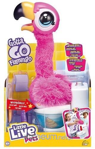 Najśmieszniejszy Flaming jakiego kiedykolwiek karmiliście! Gdy zje specjalny pokarm i zacznie śpiewać piosenkę zaraz musi biec do toalety, trzymajcie więc toaletę w pogotowiu! Nakarm Flaminga specjalnym pokarmem i zobacz co się będzie działo! Po wsypaniu pokarmu specjalną szufelką do dzioba Flaminga musi on go przesunąć w dół tułowia więc jego szyja zaczyna falować. Gdy zacznie śpiewać piosenkę to znak, że musi zostać posadzony na toalecie wypełnionej wodą. Co dostało się do środka, musi wydostać się na zewnątrz! Flaming robi neonowa kupkę wydając przy tym śmieszne dźwięki. Powtarza to co się do niego mówi. Po przelaniu zawartości toalety do szufelki możemy zacząć karmienie od nowa.