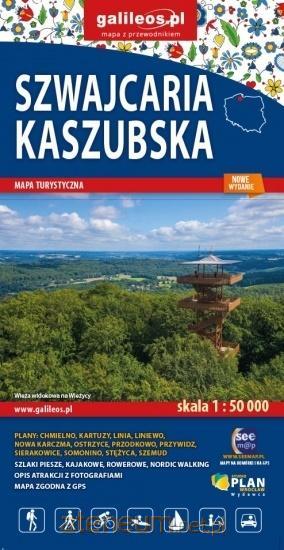 1 strona - zawiera mapę Szwajcarii Kaszubskiej, Kaszubskiego Parku Krajobrazowego, okolic Kartuz, Chmielna i Sierakowic wraz z Wieżycą, Ostrzycami i Szymbarkiem w skali 1 : 50 000. Mapa posiada siatkę GPS zgodną z WGS 84. Na mapie znajdują się nazwy głównych ulic w miejscowościach, aktualny przebieg szlaków pieszych i rowerowych z kilometrażem, granice parków krajobrazowych i obszarów chronionego krajobrazu.