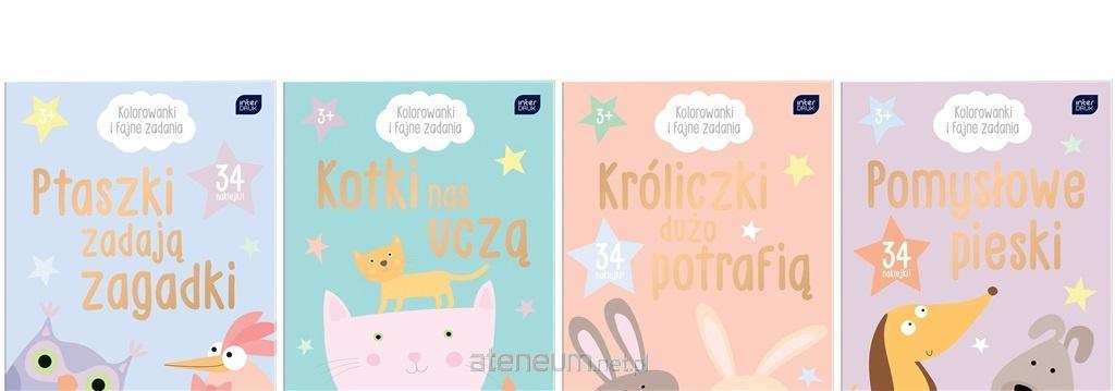 Format: A4. Liczba kartek: 16. Okładka z metalicznym efektem. Seria książeczek z kolorowankami i ciekawymi zadaniami, które uczą, bawią i rozwijają wyobraźnię. Każda z książeczek zawiera 34 naklejki. W serii dostępne są 4 tytuły: Ptaszki zadają zagadki, Kotki nas uczą, Króliczki dużo potrafią i Pomysłowe pieski.