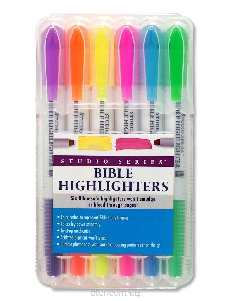 Zestaw 6 bezpiecznych dla Biblii zakreślaczy marki Peter Pauper Press. Zawiera kolory niebieski, fioletowy, zielony, różowy, pomarańczowy i żółty. Bezkwasowy pigment nie rozmazuje się na stronach oraz nie uszkadza cienkich stron. Płaskie końcówki układają się gładko na delikatnym papierze. Wytrzymała obudowa z twardego plastiku z otworem na zatrzaski chroni zestaw w podróży, może służyć również jako podstawa.