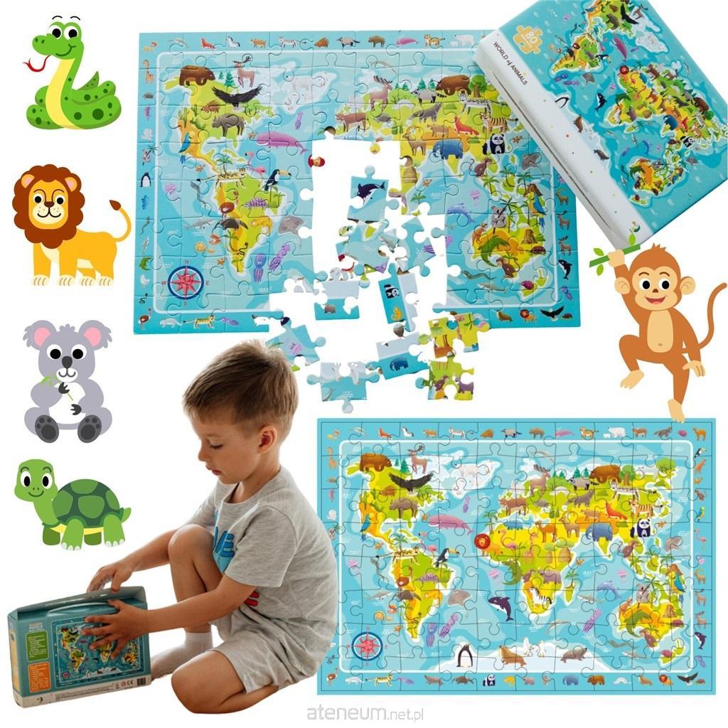 Puzzle obserwacyjne rozwijają spostrzegawczość, cierpliwość, koncentrację i pamięć u dzieci. W ramce puzzli znajdują się pojedyncze elementy, które należy odszukać na obrazku. Puzzle obserwacyjne Mapa Świata zwierząt po ułożeniu przedstawiają mapę Świata, wraz ze zwierzętami zamieszkującymi dane regiony świata
