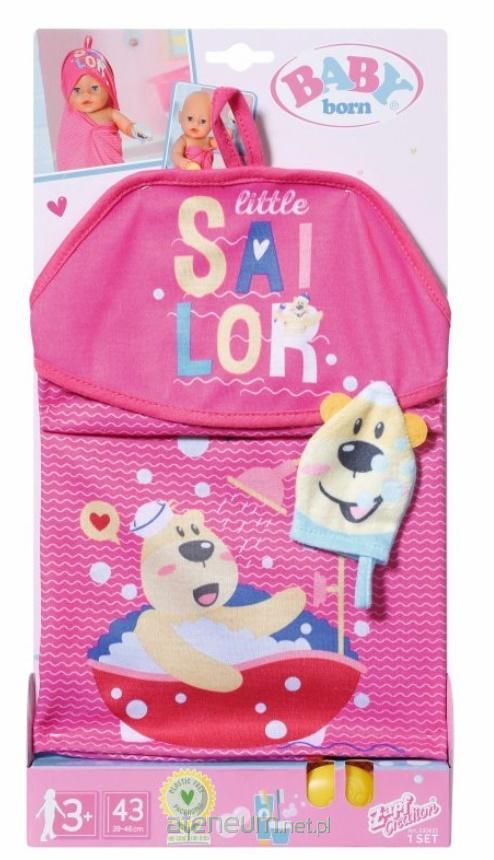 Niedźwiadek Bruno jest kapitanem wanienki, więc rozchlapuje wodę gdzie popadnie. Na różowym ręczniku białe kreski wyglądają jak fale. Zanim owinie się ręcznikiem i założy kaptur, BABY born dokładnie wyszoruje się flanelową myjką i żółtym mydełkiem.