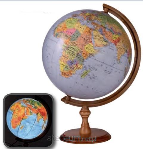 Globus 320 mm podświetlany. Jest to globus zawierający mapę polityczną Świata, natomiast po podświetleniu pojawia się mapa fizyczna. Więc na jednym globusie mamy 2 mapy. Świetnie nadaje się do przyswajania geograficznego położenia nie tylko państw, ale także możemy znaleźć szczyty gór, niziny, wyżyny itp. Podstawka drewniana.