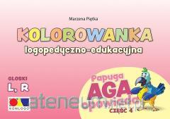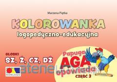 Kolorowanka logopedyczno-edukacyjna ,,Papuga Aga opowiada. Część 1 - ś, ź, ć, dź" - to zeszyt z 10 rysunkami do kolorowania, po jednym z każdej z 10 historyjek zestawu ,,Papuga Aga opowiada. Część 1". Uzupełnieniem ilustracji są wyrazy i teksty zawierające głoski: ś, ź, ć, dź.