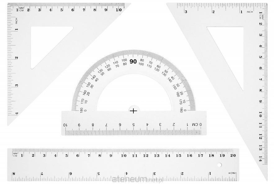Zestaw wykonany z przeźroczystego trwałego tworzywa. Komplet zawiera: 2 ekierki, linijkę, kątomierz. Opakowanie: blister