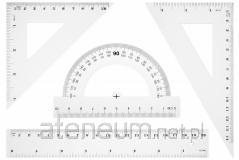 Komplet wykonany z elastycznego tworzywa. Komplet zawiera: ekierkę, linijkę, kątomierz. Opakowanie: blister
