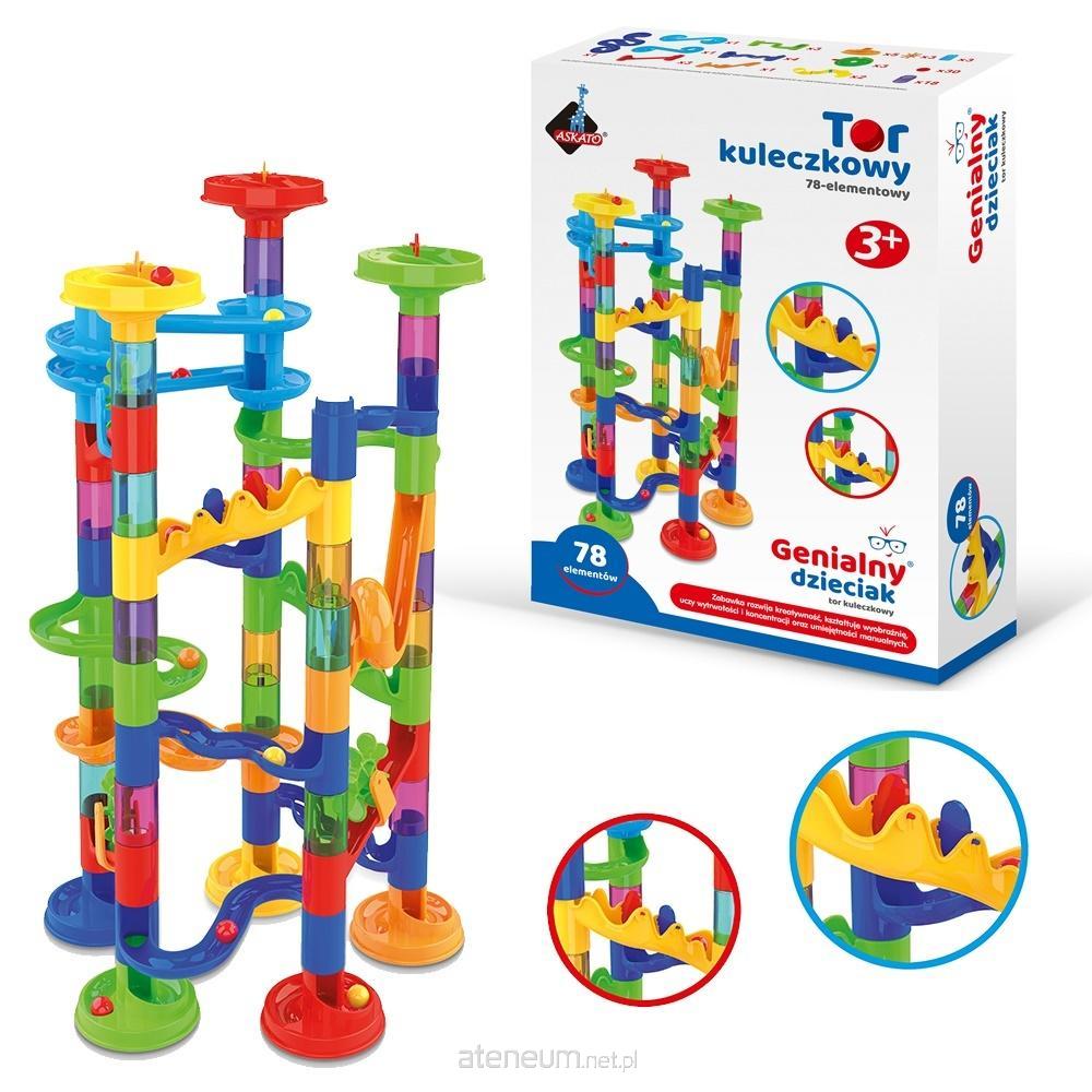 Tor kuleczkowy - 78 elementów48 elem. toru + 30 kolorowych kulekZestaw, który składa się z kolorowych i niełamliwych części oraz plastikowych kuleczek, dzięki któremu można tworzyć super trasy.Dodatkowo zestaw wyposażony jest w przeźroczyste elementy dzięki którym dziecko widzi kulki przelatujące przez zbudowaną konstrukcję. Puszczanie w ruch kuleczki i obserwowanie ich ruchu to mnóstwo radości. Dziecko może bawić się samo, z przyjaciółmi lub rodzicami organizując wyścigi.Dzieci mogą odwzorowywać modele narysowane na pudełku lub eksperymentować i budować własne konstrukcje. Zjeżdżalnie, mosty, kolumny, kołowrotki, spirale i kominy mogą być łączone na różne sposoby. Zabawka stymuluje kreatywność, rozumowanie przestrzenne oraz rozwija zdolności manualne.Zabawa z torem to niekończąca się przygoda. Możliwość samodzielnego montażu i dowolność w przestawianiu i konstrukcji elementów sprawi maluchowi ogromną satysfakcję, będzie dumny, że sam zbudował tor i nadał mu kształt. A co więcej, może tworzyć wciąż od nowa urzeczywistniając coraz to inne projekty.wiek 3+wymiary opakowania: 27x10x36 cm