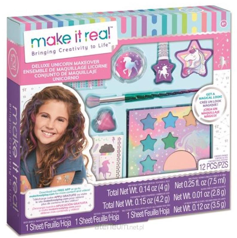 Zaproś najlepsze przyjaciółki do swojego studia wizażu. Dzięki wyjątkowym umiejętnościom zachwycisz każdą dziewczynę niebanalnym makijażem, który podkreśli jej urodę, a także doda odrobinę blasku. Wykorzystaj paletę magicznych cieni, muśnij różem policzki, pomaluj paznokcie i zrób kolorowe pasemka na włosach. Całość dopełnij kryształowymi ozdobami i kolorowymi tatuażami. Ruszajcie na imprezę i bawcie się doskonale! Zestaw Make it real to fantastyczny pomysł na prezent dla nastolatki, która pragnie poznać tajniki makijażu i świetnie się przy tym bawić. W opakowaniu znajduje się paleta sześciu pudrowych cieni, róż do policzków, lakier do paznokci, diamentowy błyszczyk, naklejki i pilniczek do manicure, kolorowa kreda do tworzenia pasemek na włosach oraz arkusz magicznych tatuaży.