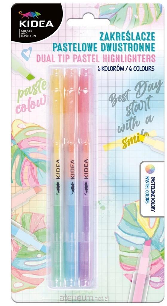 Zakreślacze 2 w 1: jeden zakreślacz dwa kolory! Zestaw trzech zakreślaczy w 6 pastelowych kolorach żółty, zielony, pomarańczowy, niebieski, różowy i fioletowy. Dzięki takiemu rozwiązaniu możemy zaoszczędzić miejsce w piórniku i cieszyć się szeroką gamą kolorystyczną. Modne, pastelowe odcienie doskonale posłużą w oznaczaniu ważnych informacji i sprawią, że notatki staną się bardziej przejrzyste i czytelne. Zakreślacze idealnie sprawdzą się w szkole oraz podczas nauki do egzaminów.