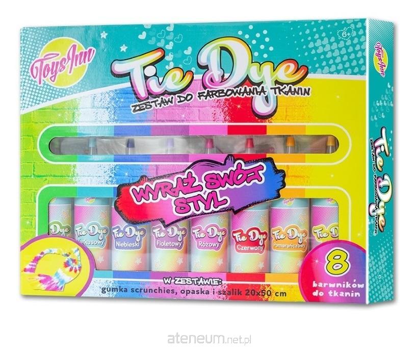Wyraź swój styl, baw się kolorami i stwórz niepowtarzalną apaszkę lub ozdób włąsną koszulkę. Zestaw zawiera 8 butelek z barwnikiem do tkanin po 5,2 g (żółty, pomarańczowy, czerwony, różowy, fioletowy, niebieski, turkusowy, zielony), bawełnianą, białą apaszkę 20x50cm, opaskę na włosy, gumkę scrunchies, rękawiczki-3 pary, obrus 91x91 cm, gumki -30 szt, instrukcję.