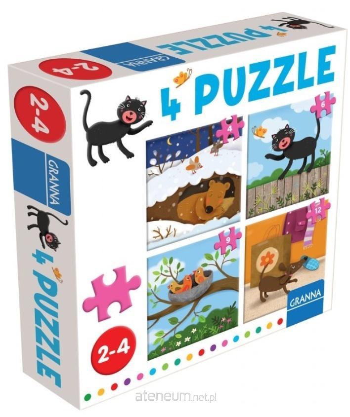 W skład zestawu wchodzą 4 puzzle: 4,6,9,12 elementowe.