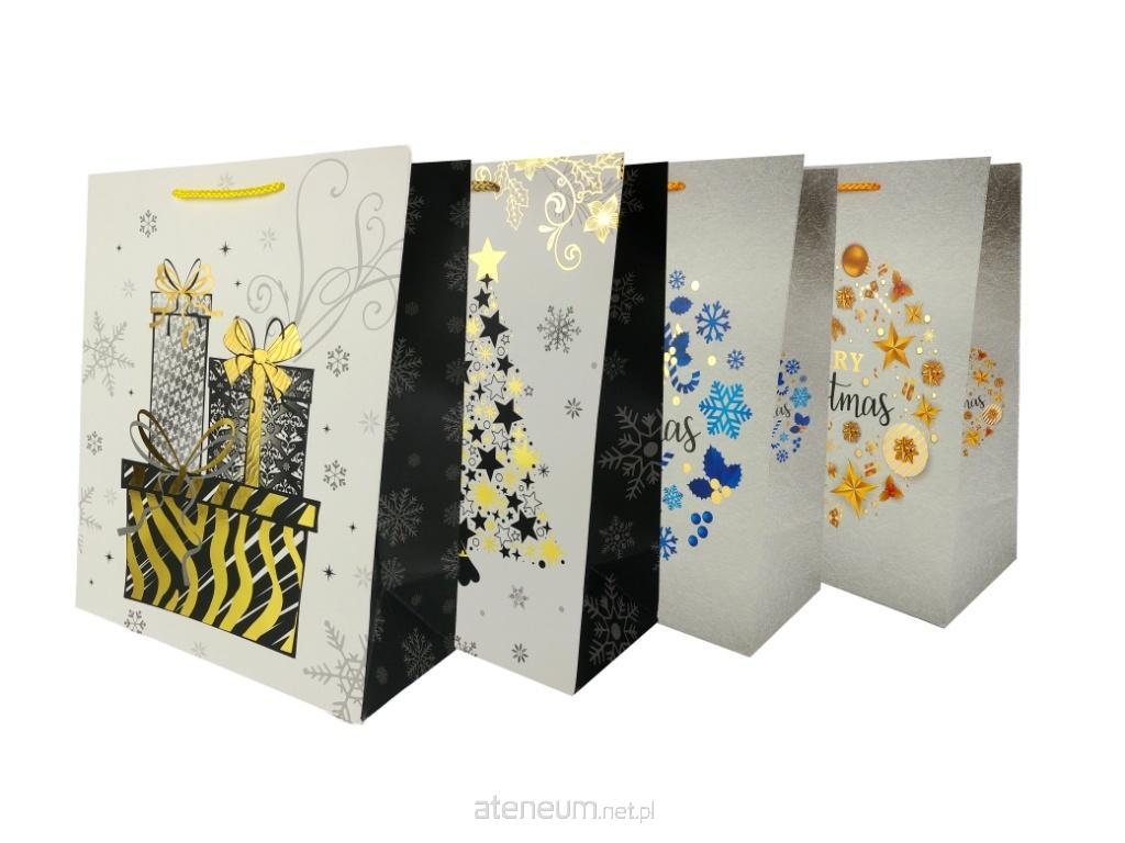Torebka świąteczna, pionowa o wymiarach 33x45,7x10,2 cm. Dostępna w 4 wzorach. Metalizowane elementy. Kolor sznureczka idealnie komponuje się z kolorystyką torebki. Posiada wzmacniany spód.