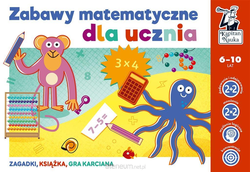 Zabawy matematyczne dla ucznia (6-10) to idealny pakiet motywujący do ćwiczeń matematycznych, który sprawia, że nauka staje się świetną zabawą i wyzwaniem. W zestawie znajduje się gra karciana na tabliczkę mnożenia, zagadki obrazkowe oraz książka z zadaniami z atrakcyjnymi poleceniami. Różnorodne formy gwarantują aktywny trening myślenia matematycznego bez nudy i żmudnych powtórek. Matematyka bez nudy! Zestaw zabaw matematyczno-logicznych buduje pozytywne doświadczenia związane z nauką matematyki. Zadania w formie zagadek obrazkowych, łamigłówek logicznych oraz gry edukacyjnej pozwalają opanować podstawy działań arytmetycznych intuicyjnie i mimochodem. Proste sytuacje z życia codziennego oraz przyjaźnie sformułowane polecenia pomagają odkrywać świat matematycznych problemów i podchodzić do nich z ciekawością. Dzięki nim uczniowie nauczą się rachować w pamięci, mnożyć i dzielić, analizować informacje, łączyć fakty, a także rozumieć związki przyczynowo-skutkowe. Pakiet zawiera blisko 100 zagadek obrazkowych dotyczących codziennych sytuacji, w których szybkie i poprawne liczenie jest niezbędne, np. zakupy, gotowanie czy oszczędzanie. W pakiecie znajduje się również książka z zadaniami ćwiczącymi umiejętność mnożenia i dzielenia w taki sposób, by uczniowie zrozumieli istotę tych działań, a nie tylko wyuczyli się wyników na pamięć. Gra karciana ćwiczy umiejętność szybkiego mnożenia. Z pomocą jednej talii można zagrać aż w 6 gier towarzyskich. Zabawne ilustracje Macieja Łazowskiego rozwijają wyobraźnię, spostrzegawczość oraz zdolność łączenia poszczególnych elementów w pary. Jest to nowe wydanie pakietu Zabawy matematyczne dla ucznia (7+). Rozwój dodawanie i odejmowanie, mnożenia, myślenie logiczne, koncentracja Autorzy Natalia i Krzysztof Minge psycholodzy specjalizujący się we wspomaganiu rozwoju dzieci. W serii również Rysuję i zgaduję. Czytanie sylabowe (58 lat) Rysuję i zgaduję. Koncentracja z detektywem Motywem (69 lat) Zabawy logiczne dla ucznia (610 lat)