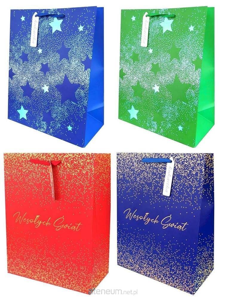 Mix wzorów wysyłany losowo. Najwyższej jakości torby wykonane z grubego, satynowego papieru, zdobione złotą lub srebrną folią, matowe lub błyszczące (w zależności od wzoru) z uchwyt z atłasowej tasiemki. Szerokość: 33 cm, długość: 46,0 cm, głębokość: 13,0 cm
