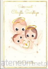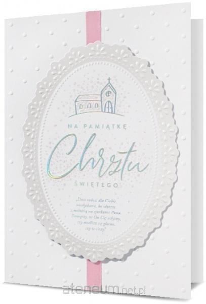 Elegancki karnet B6 z okazji chrzcin. Bogate zdobienia, połyskujące cyrkonie, perłowa folia oraz brokat. Wewnątrz karnetu życzenia oraz elegancka koperta. Format: 19.5x13 cm.
