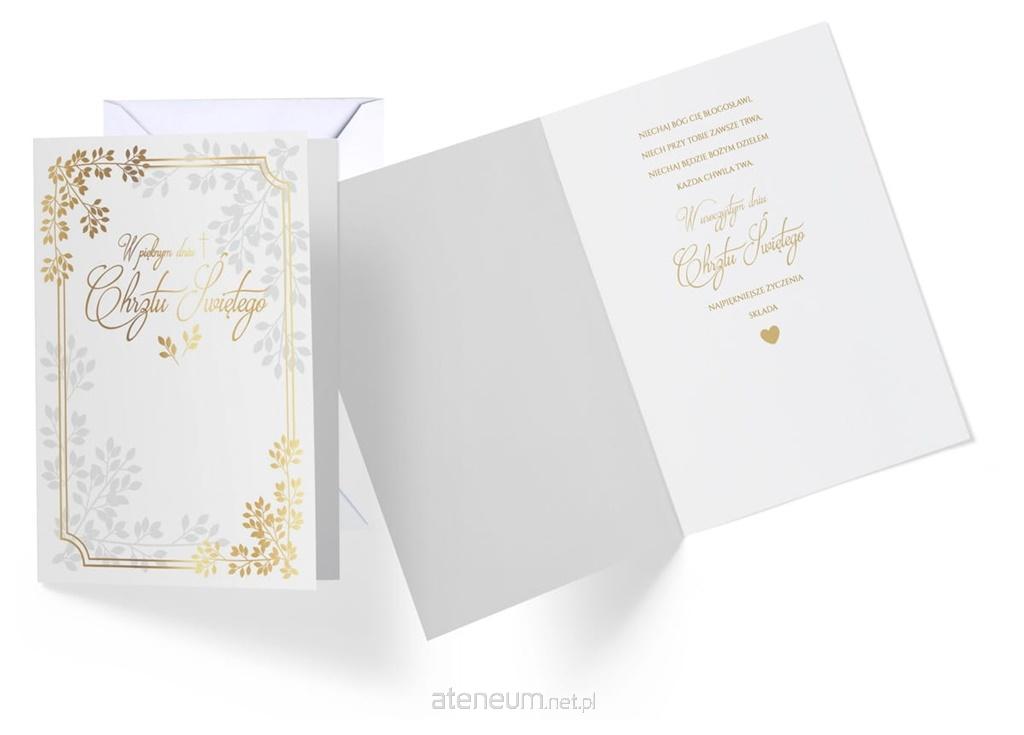 Karnet Vision "Chrzest" w powiększonym tzw. Angielskim formacie 140x190 mm. Wykonane z niezwykłą dbałością o szczegóły, zdobione folią holograficzną i w całości pokryte folią matową dla podkreślenia efektu prostoty i elegancji. Wewnątrz znajduje się tekst życzeń, a całość uzupełnia dedykowana biała koperta.