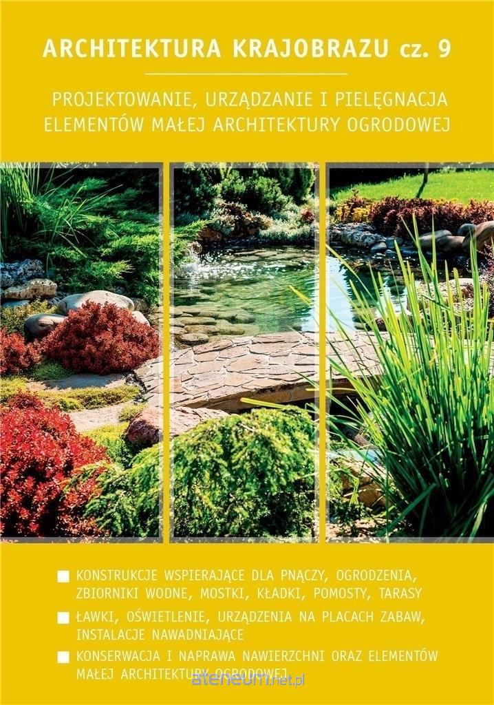 W części 9. podręcznika Architektura krajobrazu zapoznamy się z zasadami projektowania oraz budowy i konstrukcji różnych rodzajów podpór dla pnączy, ogrodzeń, ozdobnych zbiorników wodnych, mostków, kładek i pomostów, tarasów, zielonych dachów oraz takich elementów wyposażenia terenów zieleni, jak: ławki ogrodowe, kosze na śmieci, tablice informacyjne, słupki, oświetlenie, instalacje nawadniające, urządzenia przeznaczone na place zabaw dla dzieci. Nie zabraknie również informacji związanych z konserwacją i naprawą nawierzchni dróg oraz elementów małej architektury ogrodowej.