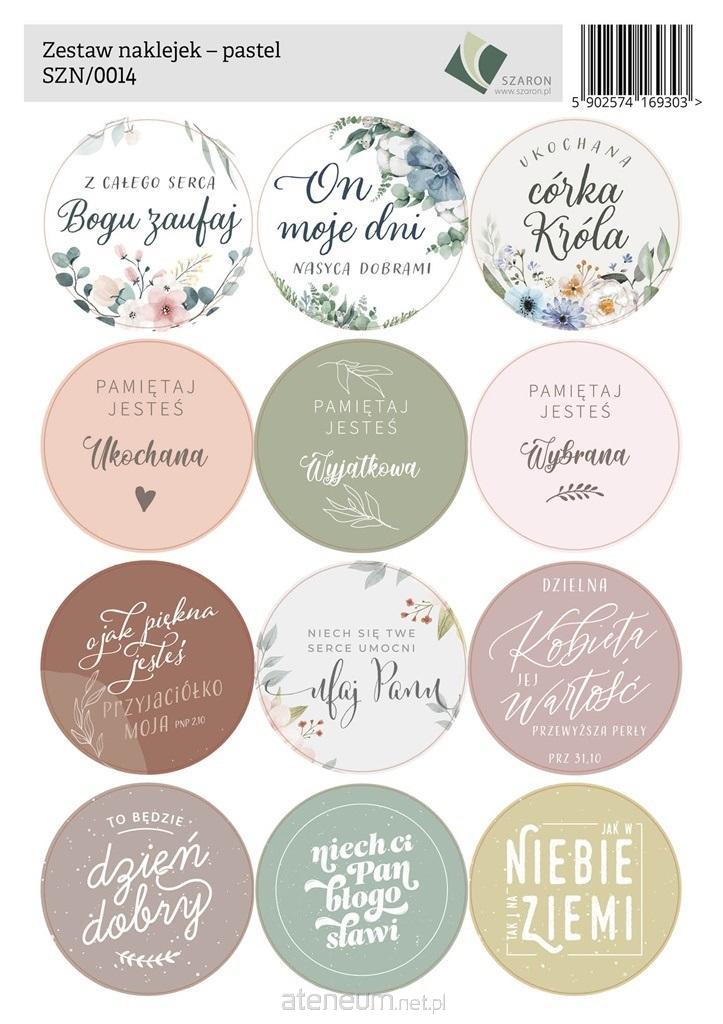 Zestaw naklejek z chrześcijańskimi hasłami w otoczeniu pastelowych barw.
