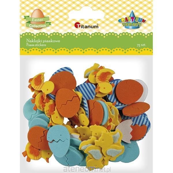 Naklejki piankowe mix. Pisanki 2-częściowe pomarańczowe i miętowe, pełne w paski niebieskie 23 x 31 mm, kaczuszka 30 x 31 mm, kurczaczek 21 x 31 mm, 75 sztuk.