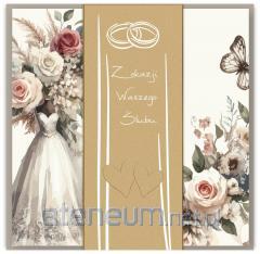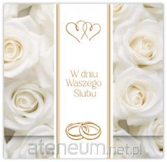 Kartka składana, zdobiona folią metalizowaną i tłoczeniami o wymiarze 11,5 x 16,5 cm w zestawie z kopertą z życzeniami wewnątrz .