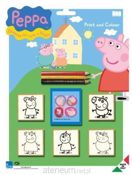 Pieczątki Świnka Peppa. W skład zestawu wchodzą: 5 pieczątek, 1 poduszeczka do tuszu i 3 kredki.