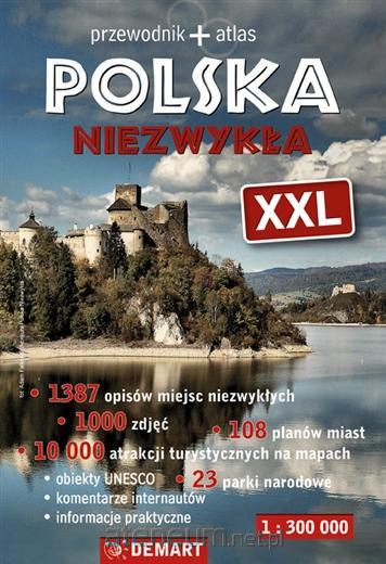 POLSKA NIEZWYKŁA XXL to połączenie praktycznego przewodnika z atlasem i informatorem. Dodatkowo zawiera informacje o imprezach cyklicznych oraz wykaz największych atrakcji Polski ilustrowany efektownymi mapami w kilku kategoriach: Zamki i pałace; Świątynie; Przemysł i technika; Militaria; Kultura ludowa; Zespoły urbanistyczne i zespoły zabytków; Przyroda; Imprezy; Rekordy.