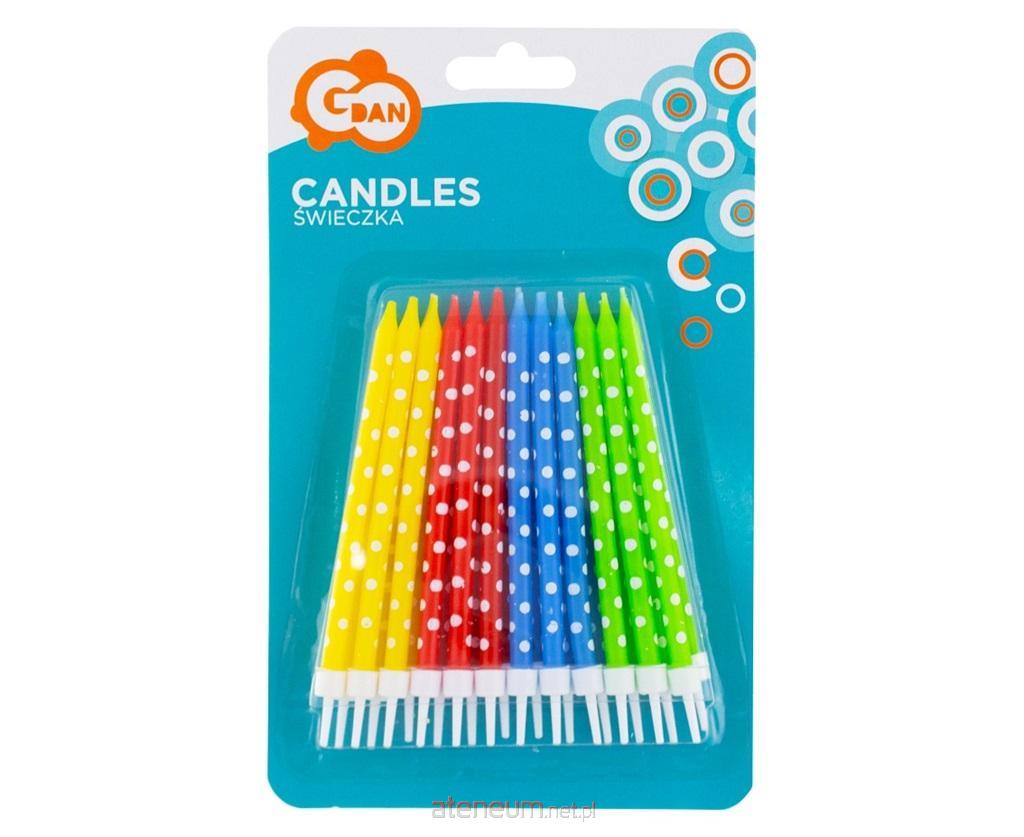 Świeczki urodzinowe, super dekoracja na tort dziecka. Świeczki w 4 kolorach ozdobione białymi grochami. W opakowaniu znajdują się 24 sztuki.